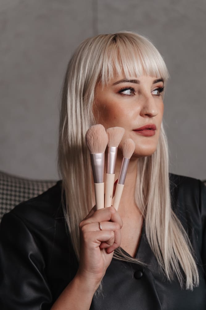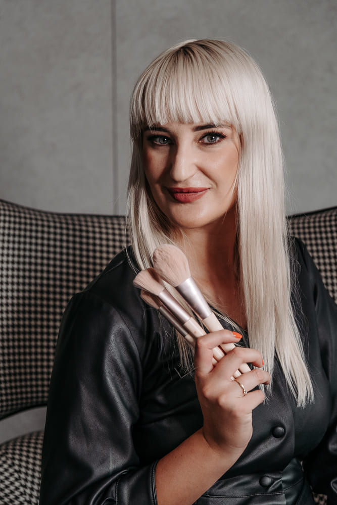 Do wykonania zdjęć wizerunkowych nie potrzeba wiele – idealnie sprawdzi się gładka ściana, czy wnętrze salonu lub gabinetu. Aby urozmaicić zdjęcia a zarazem momentalnie wywołać skojarzenia u swoich potencjalnych klientów – warto zapozować z akcesoriami, z których korzystasz podczas codziennej pracy. Oczywistym wyborem w przypadku Kasi były pędzle do makijażu.